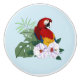 En rödmakakapapegoja sitta bland tropiska blommor och löv i en ljusblå bakgrund