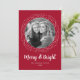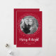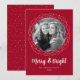 Festivt rött helgdag-kort med ditt foto omgivet av en prickad cirkel ram. "Merry and Bright" visas i ett fet, vitt, handskrivet skript med ditt namn och året som visas nedan. Kortet återgår till ett vitt prickat mönster med röd bakgrund.