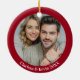 Jul önskemål och mistletoe kysser! Det är julen! Den här beundransvärda röda och vita prydnaden kommer säkert att göra helgdag glad! Lägg till ett foto och namnen på baksidan av dekorationen. Underbar för nylweds! Ställe på träd för lite extra charm. Designad av Blackberry Boulevard.