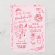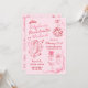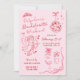 Cute cupid-themed romantic Bachelorette Weekend invitation in pink and red with digitally hand-drawn coquette details with lots of bows, like a disco-ball, a cupid ready to fire an arrow, drink glasses, and a tiara.