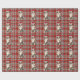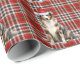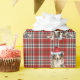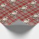 Den här hund är en tricolor Australian shepherd och bär en röd julhatt på en roligt röd och grönt pläterad bakgrund.
