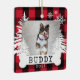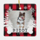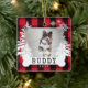 Rustic farm resh Julgranar pet ild Photo Keepsak ornament. Ornamenten kan anpassas med djurets namn, året och fotot. Röda schackbrädet visade bakgrunden med gräs träd och snöflingor. Husets namn visas på ett vitt hund ben. Bild efter Moodthology Papery.