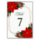 Ett kort för bordsnummer i julafton i bröllop har en elegant präglad typografi, rödblommor i blommigt, rödbär, gräs-koner och grönt löv och ett guld glatt geometriskt ram.