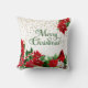 Den här elegant Helgdag-kudden har en gräns i grund av röd poinsettia, holly, greer och guld förskönande. I ena änden är en röd kardinal som genomsyras av en vit poinsettia blommar. Den översta högerna har en mindre röd poinsettia bouquet och "God jul" är i grönt stiliserad text i mitten. Allt placeras på en vit bakgrund med guld star-konfektyrer. Baksidan av kudden har samma bild utan texten.