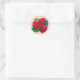 Den här konstruktionen har tre juikhaltiga röda hallon framför grönt löv på en ljus rosa, horisontellt strimlad bakgrund.