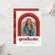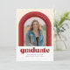 Den här studenten-annonsen i roligt har en båge med olika röda nyanser runt ett enda foto. Kortets baksida har en samordnande plats i rand mönster och utrymme för ett personligt meddelande eller inbjudningsinformation för ett studenten firande.