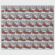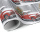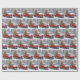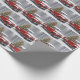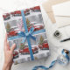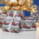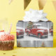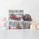 A classic red pickup truck is parked in a snowy landscape, carrying a Christmas tree adorned with colorful lights