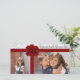 Ett jakande fotokort ser ut som en gåva med roligten stor röd bugg, söt och kreativ vit damm "omsluter papper" bakgrund med en bild av ett krimson band. Det är så roligt att kapa, vika och tejpa presentlådorna och fästa dekorativa sammet- eller satin-emblem när du förbereder presentningen. Den här platta buggbilden är nästan som roligt. All design Copyright © www.CustomChristmasPhotoCards.com Ställe Holder Photography © Storytree Studios, Stanford, CA