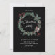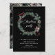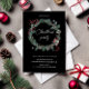 Julfestinbjudan med en vinter-grön vinterkrans som är sammanflätad med rött rosett band, omringad runt ett elegant-skript med typsnittet "Jul Party".
