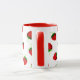 Kaffe mugg i ett utspridt mönster av röda jordgubbar på vit bakgrund