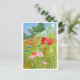 Ett söt-vykort med en blommigt vattenfärgsmålning av en röd och rosa vallmo-blomsterträdgård nära en vit betesstaket med intressant perspektiv och grönt träd i bakgrunden.