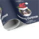 En skräddarsydd julfotomall där det finns en röd jultomatillustration av Destei placeras ovanför ett runt foto. Tomten har en grönt Jul Holly-anläggning på sig och färg är blått. Under bilden finns det två anpassningsbara textområden.