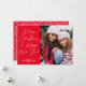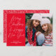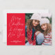 Det här söta men moderna helgdag-kortet har ett vitt kalligrafiskt skript över en fektiv röd bakgrund. Det kalligrafiska manuset hälsning på framsidan säger "God jul och Gott nytt år". Den här designen rymmer ett fyrkantigt foto på kortets framsida. På baksidan hittar du ett festivt rött och vitt handritat mönster som kan tas bort om det behövs. Du kan också lägga till ytterligare ett foto eller text till baksidan genom att välja "anpassa designen ytterligare".