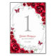 Red silver and white Quinceanera celebration table number cards. Features, script font, silver butterflies, watercolor red roses and tiara. Perfect for an elegant princess style glam celebration. Personalize with your own details. Printed Zazzle invitations or instant download digital printable template.