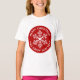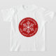 En vit snöflinga med "God jul och Gott nytt år" på en feströd cirkel.