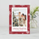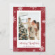 Rött snowflake-fotojulkort med snöflingor på en snöröd bakgrund. Anpassa det här fotojulkortet enkelt med ditt foto och din familj namn.