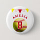 Knappen Red Softball Boll Bunting Flaggor Barns födelsedag. Utformningen har softball och buntning av flaggor i rött, vitt och gult färg. Lägg till ditt namn och din ålder.