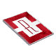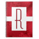 Ett klassiskt utseende med modern beröring. Ett rött monogram inuti en vit rektangel mot en röd spegelbakgrund.