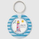 En nyckelkedja med ett nautiskt tema. Designad på ett blå strippat mönster och ett cirkulärt nautiska ram överst. En rödstrimlad fyr och en strand boll, med ett leende sol och fiskmås som flyger av i den avstånd delen av ram. Anpassa med initialer och bröllop-datumet.