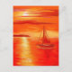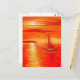 Oljemålning av ett par som seglar längs en segelbåt mot en röd hett solnedgång. Bild finns tillgänglig på olika presenter och produkter. Postkort.