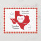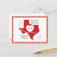 A casual and fun way to share your joy well in advance of your big day. Send these Texas save the date cards out to all your family and friends. Design features a large state shape with a heart made from a white ribbon with black dashes. Space inside the heart for your date and at the bottom for your location. Bordered with a coordinating gingham pattern. Perfect mix of classy and rustic in case you haven't decided what style you're going with! Available in red, blue, and yellow. Matching products available.