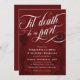 Elegantens burgundy Halloween eller bröllopsinbjudan med Til död gör att vi kan skriva i ett mycket vitt kalligrafiskt skript. Lägg till din inbjudningsordalydelse i vitt mot en röd mörk med mörkare skelett.