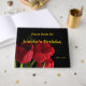 En bukett med scarlet röda tulpanblommor och grönt löv sätter på en ren svart bakgrund den här fantastiska födelsedagsfesten i blommigt gäst bok. Anpassa all text till specialtillfället.