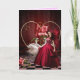 En underbar kärlek-älv med ruby red boll-gegna kläder står på ett kontrollerat golv med guld hjärta, svanar och rosa ros i bakgrunden. Njut!