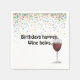 Glas av rött vin med födelsedagsfest konetti och roligt citat på vit bakgrund. Offerten kan redigeras. Bakgrunden till färg kan ändras.