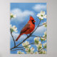 En pulserande röd nordlig kardinal sitter på gren i ett rödved träd, omgiven av känsliga vita blommor. Blå himmel ger en fantastisk kontrast till den här bilden, och oljemålningens utseende gör att den här slående bilden får en extra att röra sig.