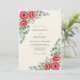 This design features vibrant red ranunculus blooms paired with lush green eucalyptus foliage. The botanical elements are arranged in delicate corners against a warm cream background, creating a romantic and timeless mood. Perfect for a sophisticated nature-themed event, the watercolor textures bring a soft, artistic feel.