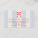 This coquette baby shower books for baby/please bring a book/book request enclosure card features a red bow on a cream background with pale blue stripes. The reverse side features a cream background with a blue bow pattern. Personalize it for your needs. You can find matching products at my store.