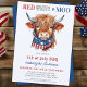 Fira Independence day med vår patriotiska 4:e juli-inbjudan med en charmerande, handmålad vattenfärg av en högland. Perfekt för husdjur och ko älskare, denna konstnärliga inbjudan familj och vänner att gå med i festligheterna med en BBQ, mat, roligt och fyrverkerier. Se vår samling för att matcha patriotisk 4:e juli-gåvor, party favors och förråd. COPYRIGHT © 2021 Judy Burrows, Black Hund Art - Med alla Höger reserverade. Red White Moo Patriotic Highland Cow 4:e juli-inbjudan