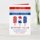 Röda vita och på väg Fjärde juli-ispinnar eller popsiklerdusch... Tack-kort i rött, vitt och blått. I utformningen visas ord "RED WHITE AND DUE" på en bakgrund av rand och popsikler med stjärnor och frasen "Tack", som skapar det ett roligt- och öga-fångstkort.