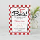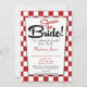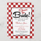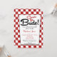 En söt röd och vit reflektor middag inbjudningskort för möhippan som har en röd och vit bakgrund som "Shower The Bride".
