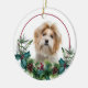 På framsidan av denna Helgdag är ett vackert porträtt av en röd och vit Shih Tzu-Hund som pissar ut från en holly och evergreen bough. Röda bär och gräs-koner dekorerar huggen och gräs sprickor. Bilden placeras på en vit cirkel inom en tunn röd linjekrets. Baksidan av dekoratet har samma vergreka och cirkel med anpassningsbarnas text i rött.