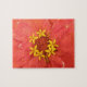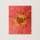 Det här fantastisk-pusslet har ett detaljerat, närliggande foto av en söt röd zinniablomma. Fotografiet togs med hjälp av makrofotografi och visar det pulserande röda och gult petal färg och den invecklade detaljen hos denna vackra blomma.