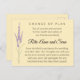 Det här redigerbara vykortet har en spricka av lavender på gulten mot bakgrund av smör. Man tillkännager en ändring av planen för ett bröllop. Texten på framsidan är redigerbar, så gå vidare och ändra detaljerna, teckensnittet storlekt, stil och färg och gör det till ditt eget. Bakgrundens färg kan också ändras på båda sidor. Det finns en fält på baksidan för mer information. Njut av din nya Editable Lavender Bröllop-ändring av vykort för plan!