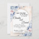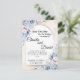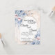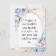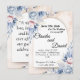 Denna bröllopsinbjudan har en mjuk och romantisk blomsterdesign med pastellblå och rosafärgade blommor. Texten visas elegant på en halvbågeformad bakgrund, vilket ger en sofistikerad och modern look. Namnen är markerade med en elegant scriptfont, med ytterligare detaljer om bröllopsceremonin, inklusive datum, tid och plats. Inbjudan innehåller också ett kontakttelefonnummer för gästerna. De känsliga blomsteraccenterna i vattenfärgstil ger en tidlös charm, vilket gör den till ett perfekt val för ett drömlikt bröllopsförklaring.