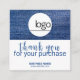 Redigerbar mall för företag som tackar dig för dina inmatningskort i förpackningen. Den här mallen kan redigeras för att lägga till din egen logotyp och all anpassningsbar som kan redigeras. Kortets färg är blått och vitt, med en bild bakom logotypen blå denim. Det finns förpackningsobjekt, t.ex. lådor, påsar och emballering, som är pappra för att följa denna rad.