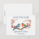 Det här redigerbara kortet för att spara datumet har två älskande fåglar som sitter på grenar med rosa blommor. Texten på framsidan är redigerbar så du kan ändra detaljerna samt typsnitt, storlek och färg.