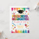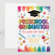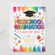 Den här inbjudan från förskolan studenten är ett perfekt för din lilla speciella firande. Utformningen har en levande regnbåge gräns, ljusa färger och lekfulla illustrationer som studentmössa, rulla, stjärnor, smiley face och skolrelaterade ikoner. Den här trevliga designen är perfekt för förskoleföretag. Familj och vänner i inbjudan och skapa en glatt stämning för förskoleceremonin i studenten.