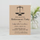 Denna redigerbara inbjudningskort har rättvisans vågskål emot en brun bakgrund. Nedan finns de redigerbara detaljerna om evenemanget. Detta kort visas för en domares pensionering men det kan också användas för alla anledningar för att fira (examen, nytt jobb, befordran, pensionering) för alla juridiska yrken.