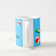 Lägg till ditt namn på båda sidor av muggen med rolig strand eller pool tema konst med en röd strandboll, grön solparasoll, semester sandaler och sololja på en vattnig blå bakgrund med lockiga vågor.