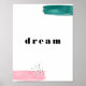 En enkel abstrakt konst parad med typografi, perfekt som ska ramas in för alla utrymmen i ditt hem. Den här designen har vattenfärgspenseldrag i rosa och teal och stänk i svart. I mitten finns "drömmen" i ord i det moderna svarta teckensnittet. Centrumet ord är redigerbart.