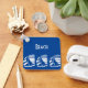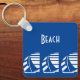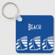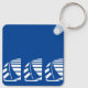 En anpassningsbar strand-, pool- eller slipnyckelring med art deco-bokstäver och ett mönster av vita segelbåtar som seglar över vindiga havsvågor, på en djupblå bakgrund.