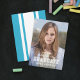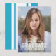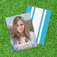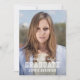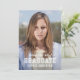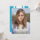 Examen fotogradueringskort i Varsity-stil. Kortet har ett vitt randigt mönster mot en redigerbar bakgrundsfärg (klicka på Anpassa för att ändra) på baksidan.