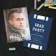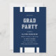 Examensannonsering i varsity-stil och inbjudan till studentfest. Inbjudan har ett mönster med vita ränder mot en redigerbar bakgrundsfärg (klicka på Anpassa för att ändra) på baksidan.