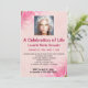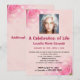 Det här redigerbara kortet har ett foto högst upp . Det här är redigerbart så att du kan ersätta det med en bild på din älskade . Nedan finns detaljerna om firandet mot en blekrosa bakgrund med rosor i två hörn . All text på framsidan av kortet är redigerbar, så ändra detaljerna samt typsnitt, placering, färg och storlek och gör det till ditt eget ! På baksidan finns ett redigerbart fält för ytterligare information . Den här redigerbara inbjudan kan användas för en minnesstund, födelsedagar, förlovningar, årsdagar, pensioneringar osv.
