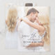 Insyn som täcker anpassningsbar- och personlig-foto på framsidan och baksidan av eleganten och moderna Spara datumbröllopsinbjudningar - innehåller vacker och elegant skripttypografi för den speciella Bröllopsdagen firande.
